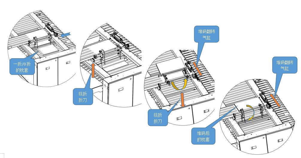 2,縱折同時完成對枕套的堆碼,整理打包的操作人員1人即可完成,可節省2-3個人的人工;